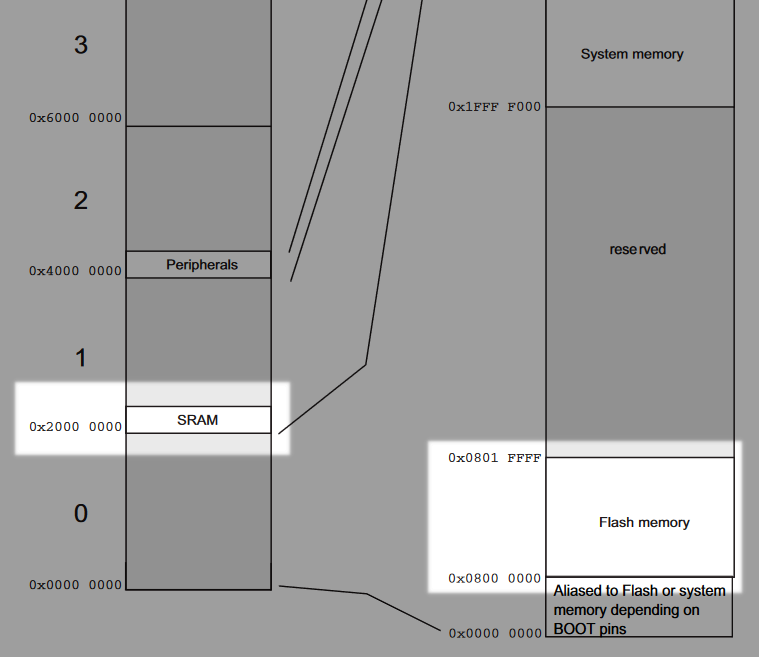 The image below is an excerpt from the datasheet and shows at which addresses flash memory and SRAM are located. Because the memory is accessed at different addresses the linker script is needed. Data needs to be written to addresses there is actual hardware memory. Certain types of data should be stored in different types of memory. For example data in SRAM is destroyed when power is lost but it’s faster to access than flash memory and perfect to store read-only data such as the actual program instructions.